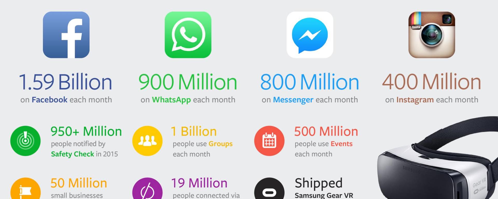 El mismo Mark Zuckerberg nos informa: «Nuestra comunidad tiene ahora más de 1,590 millones de personas. Más de mil millones de personas usan los grupos y casi mil millones usan WhatsApp.
