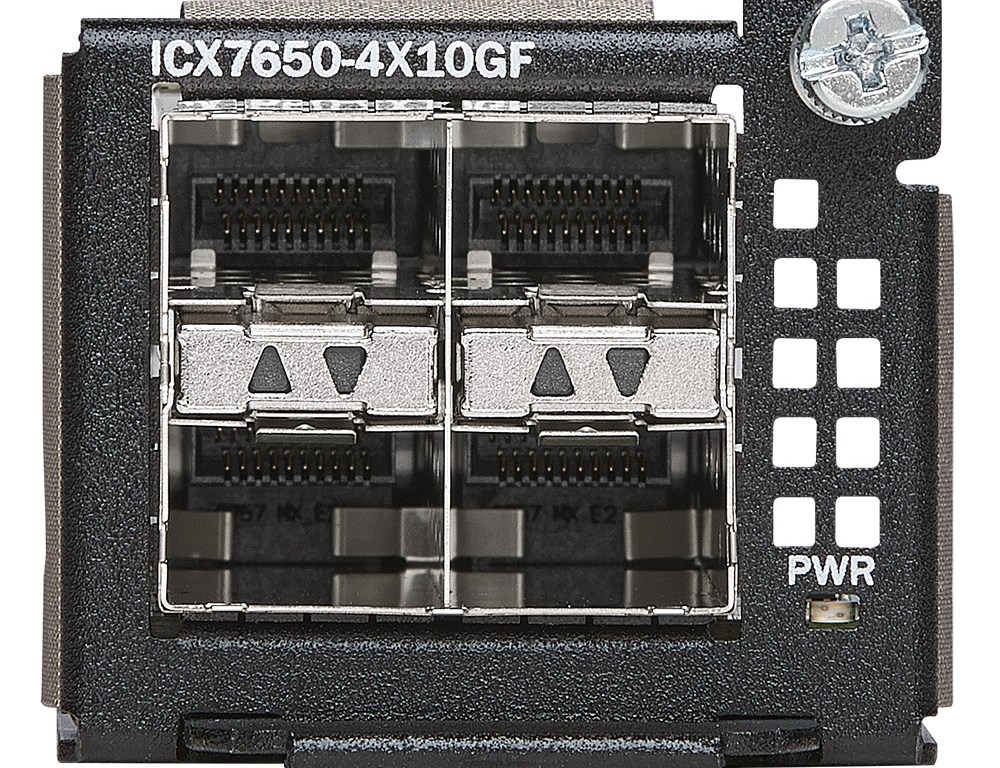 - El switch central/incorporación ICX 7650-48F ofrece una plataforma de alto desempeño con hasta 24 puertos de fibra de 10G y 24 de 1GB con las funcionalidades L3 premier de un gran switch central así como la codificación de velocidad de línea MACsec de 256 bits.