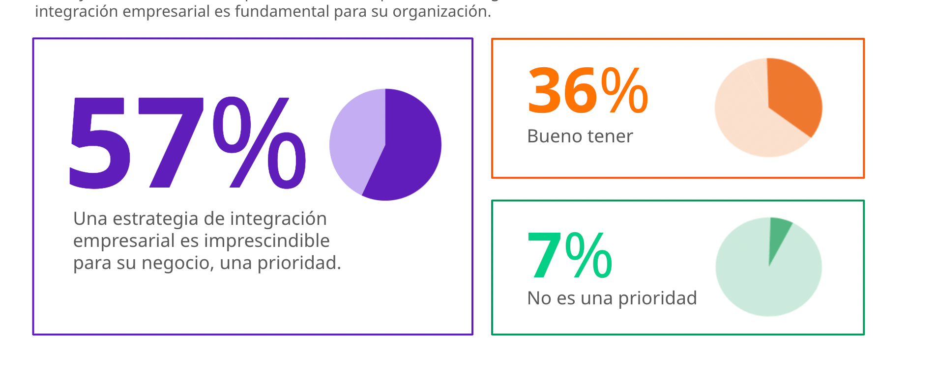 Entre otros datos, el reporte revela que para el 57 % de los encuestados, una estrategia de integración empresarial es imprescindible para su negocio, es decir, una prioridad absoluta. Sin embargo, sólo el 7% ha implementado con éxito una estrategia de integración empresarial. No hacerlo tiene un alto impacto (negativo) en el negocio, tales como : innovación trunca, prácticas inefectivas, falta de agilidad y recursos desperdiciados.